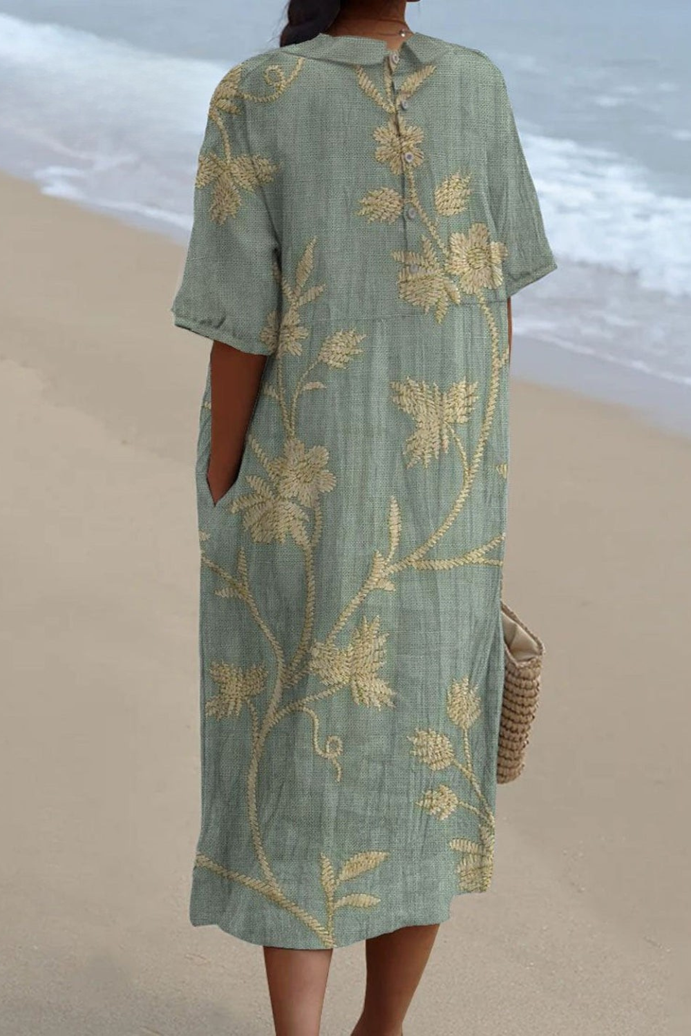 Meet Merel, the dress that radiates calm and elegance. The soft green hue and delicate embroidered flowers create a natural and refined appearance. The loose fit, short sleeves, and button opening at the back make it stylish and practical.